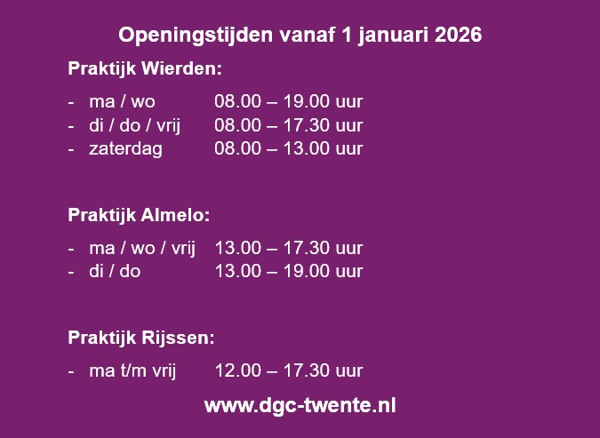 | Oudjaarsdag | Praktijk Wierden sluit om 12.00 uur, Almelo en Rijssen gesloten |