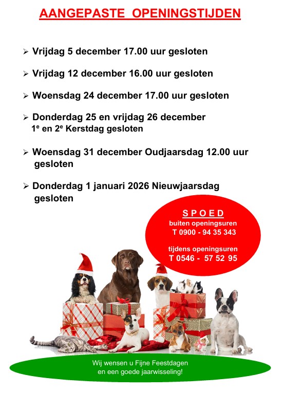 Buiten openingstijden wordt u doorgeschakeld naar de dienstdoende dierenarts.